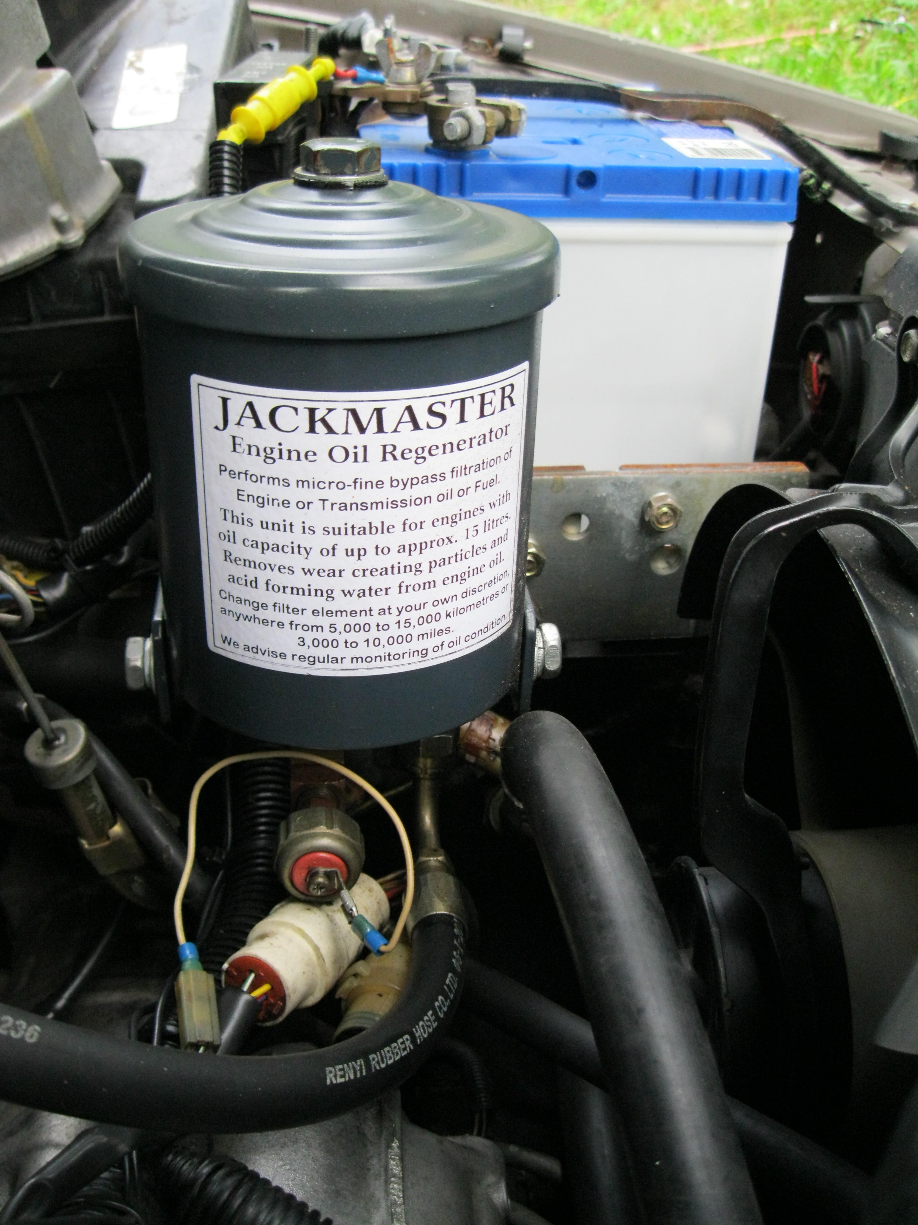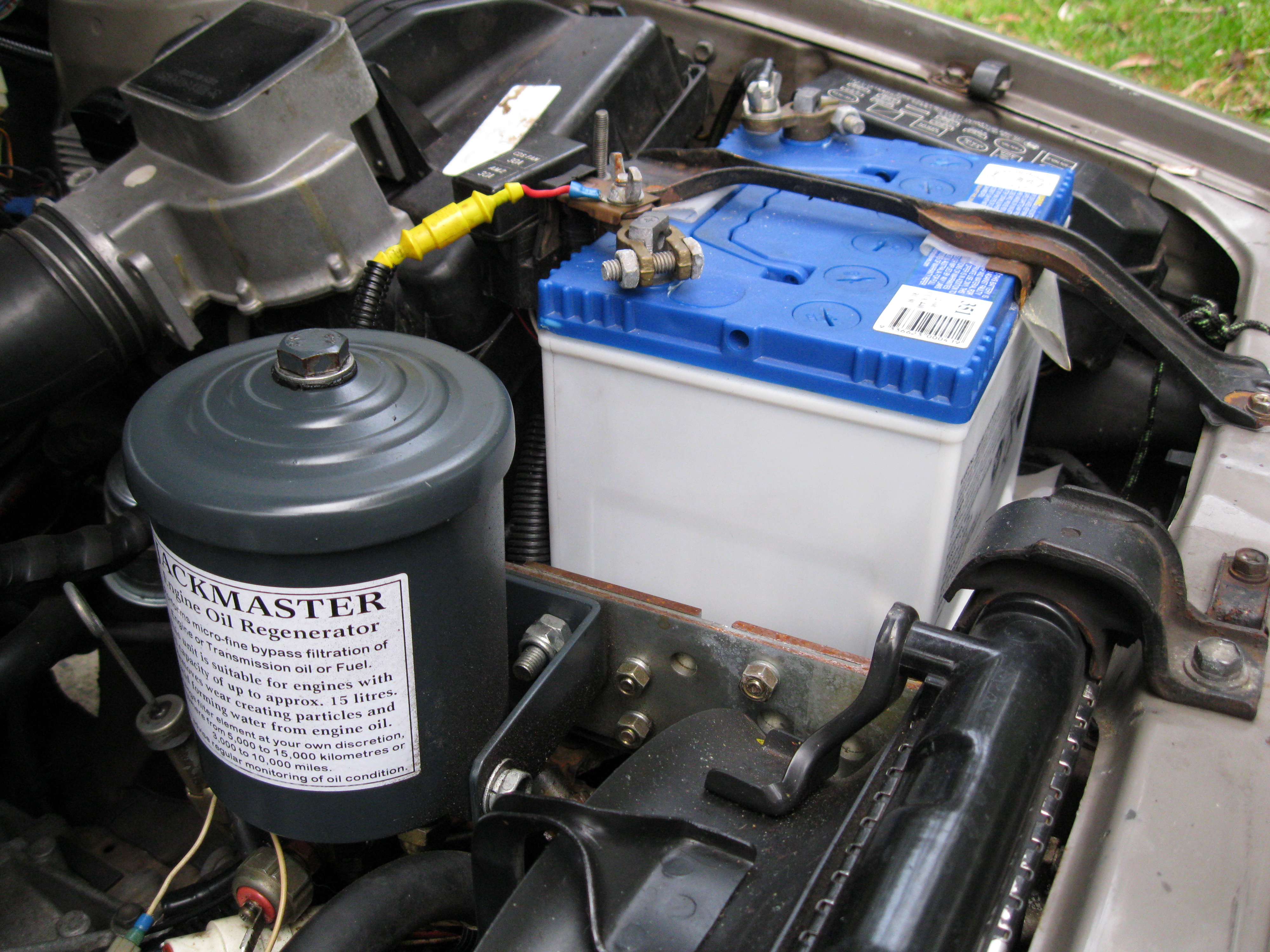Bypass engine oil filtration... Thanks a lot to Jim Elkins of Jackmaster Oil Filters at jackmasteroilfilters.com.au who provided me with a lot of authoritative information on engine oil for this section based on his depth of experience and expertise in this area. At the bottom of this web page are seven (7) extremely high resolution images of a bypass engine oil filtration installation that I have completed on a front-wheel drive 1986 Toyota Camry SV11 which had a 2.0 litre engine with electronic fuel injection (EFI). These images total about 21 megabytes in size, on account of the limited experience of the author of this website using a digital camera and on account of the hurried manner in which he captured the images. These images were captured in February, 2011, two and a half years after the author of this website first installed this bypass engine oil filtration system in August, 2008. It should be obvious by now that conventional full-flow engine oil filtration is far from ideal. Bypass filtration is a vastly superior form of filtration which is used in conjunction with full-flow conventional engine oil filtration. While the engine oil still cycles throughout the engine via the full-flow filter in the normal way, the use of additional bypass filtration involves diverting a portion of the oil from this cycle to a thick, tightly-wound cellulose bypass filter element which is essentially like tightly-wound tissue paper and is much finer and denser than the conventional full-flow paper filter. The bypass filtration material is contained within a strong, synthetic, outer mesh to ensure that none of it ever breaks off and finds its way into the oil and into the engine. After the oil has passed through the bypass filter, it returns to the engine (eg. via an oil hose connecting through the oil cap) and rejoins the oil circulating around engine. The bypass filter element removes all particulate contaminants larger than 3 microns in size from the engine oil, as well as all water, whereas a conventional full-flow filter fails to remove a significant percentage of particulate contaminants less than 30 microns in size and fails to remove any water from the engine oil. The result of bypass filtration is immaculately clean engine oil all of the time and dramatically improved engine performance. The interval for draining and replacing the engine oil can be increased from every three months or 5,000 kilometres (3,000 miles), whichever comes first, to every 50,000 kilometres (30,000 miles). Bypass engine oil filtration succeeds where conventional engine oil filtration fails… Whereas a typical full-flow filter can remove most particles larger than 30-40 microns in size but still lets a large percentage of particles smaller than 30 microns through, a bypass filter removes the following contaminants from the engine oil: